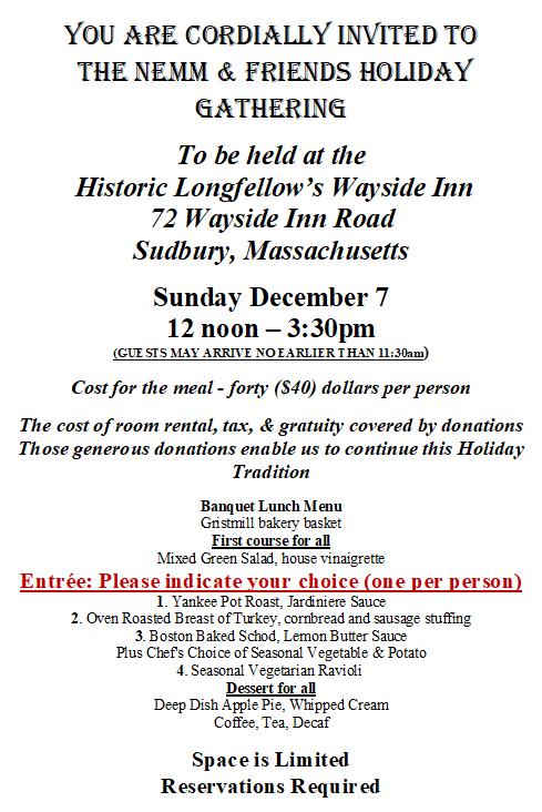 December 7 NEMM & Friends Holiday Gathering (see below)
